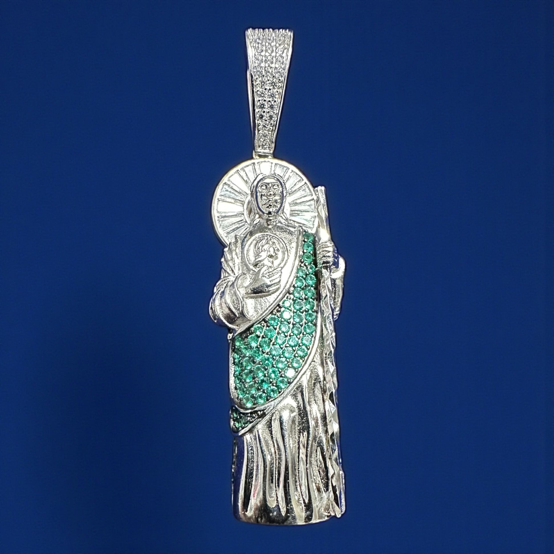 Honor faith and protection with this beautifully crafted 3D Saint Jude pendant, made from genuine 925 sterling silver. Designed with depth, dimension, and shimmering stones, this piece stands out with detailed craftsmanship and vibrant green accents representing hope and healing.