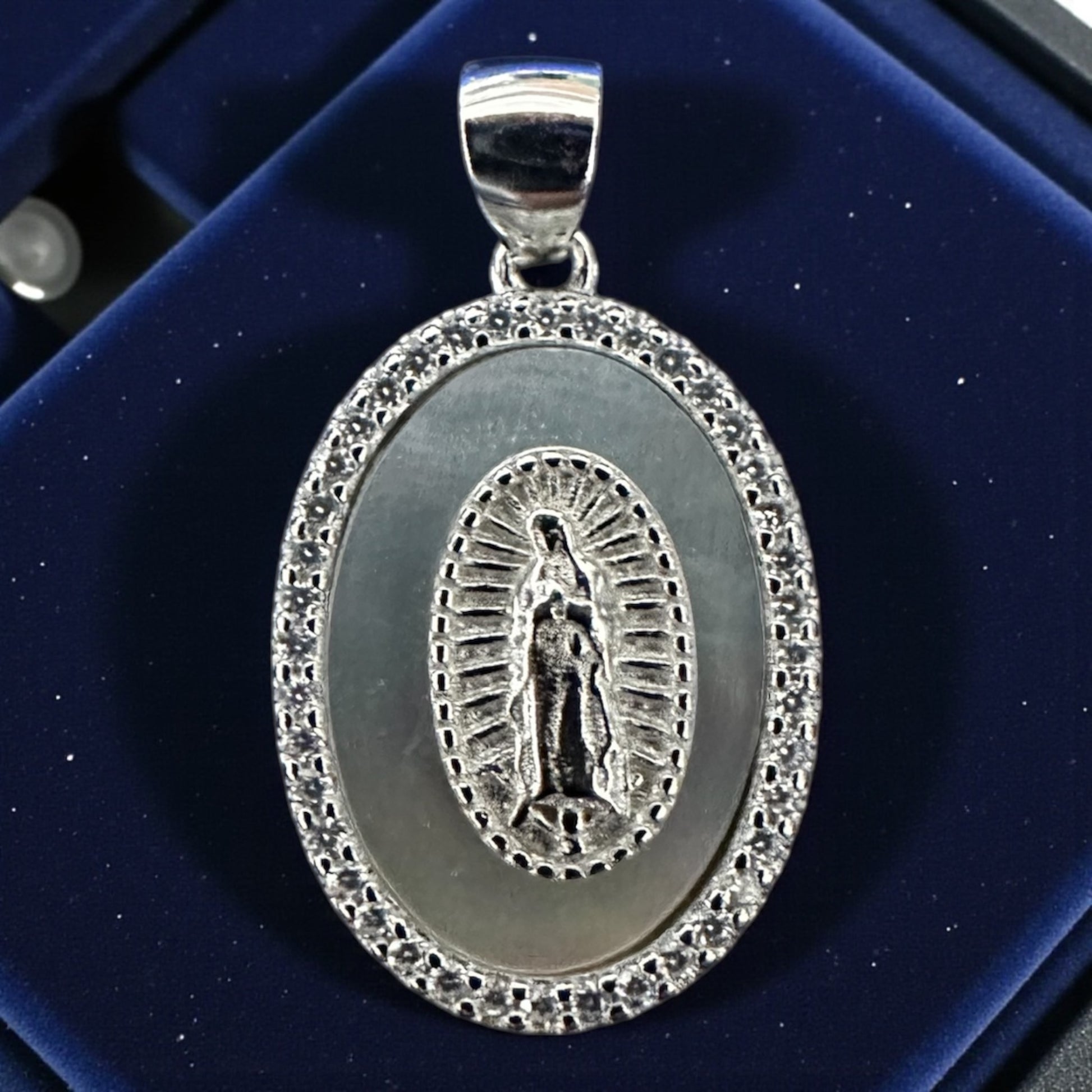 This oval Virgin Mary shell pendant features a polished mother-of-pearl style shell center with a raised depiction of the Virgen de Guadalupe, bordered by sparkling CZ accents for a radiant finishing touch.